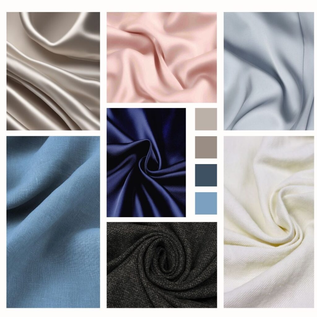 Brushed silk, matte satin, velvet, and cotton-linen blends. Structured tailoring with soft accents (e.g., a wool coat with silk lapels).