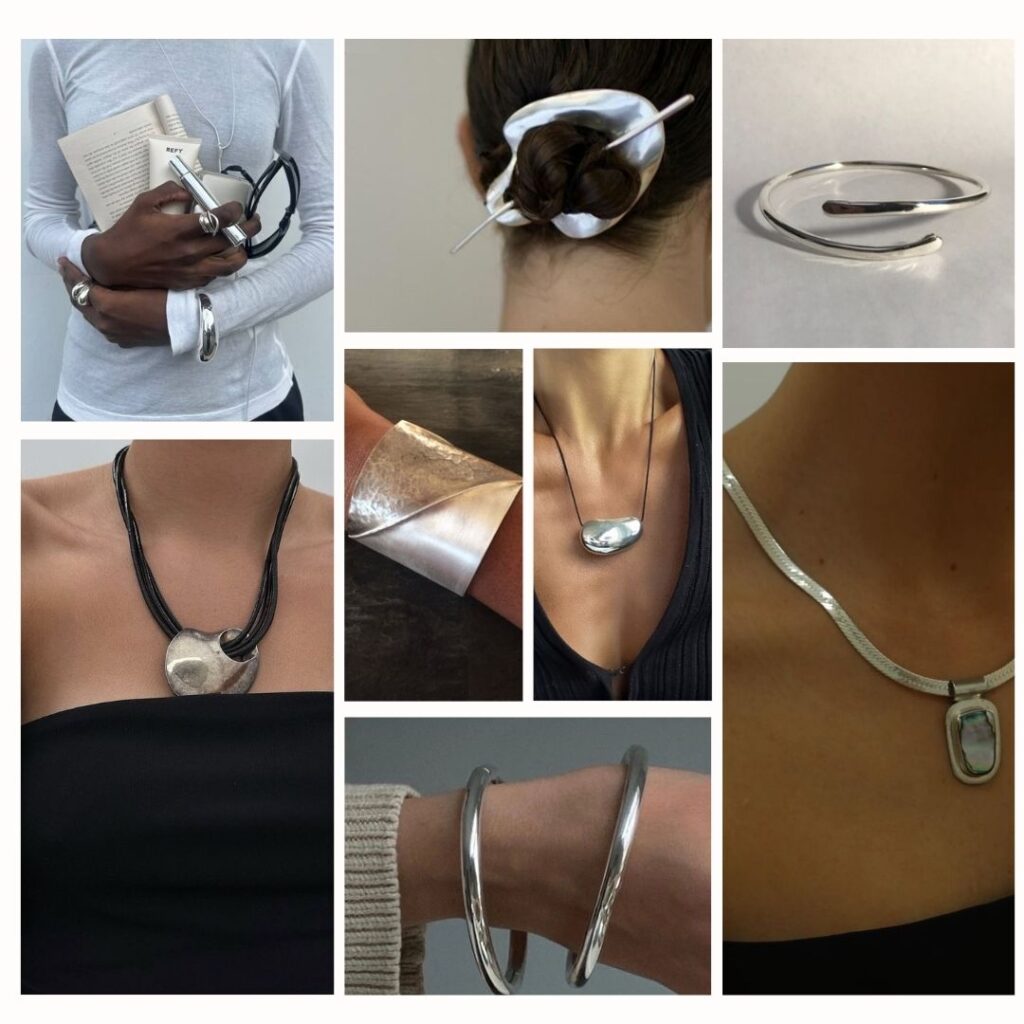 Leather-bound notebooks, structured handbags, or vintage pins. Slingback heels or sleek flats in muted metallics or heathered neutrals.