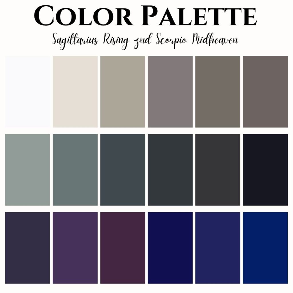 Use your this color palette to energize Scorpio’s darker hues. Let Sagittarius rising bring flashes of bold color, while Scorpio grounds it with intensity.