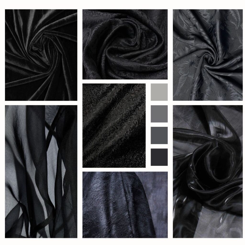 Velvet, silk, leather, suede, jacquard, brocade, organza. Embroidery, handwoven textures, or layered prints.