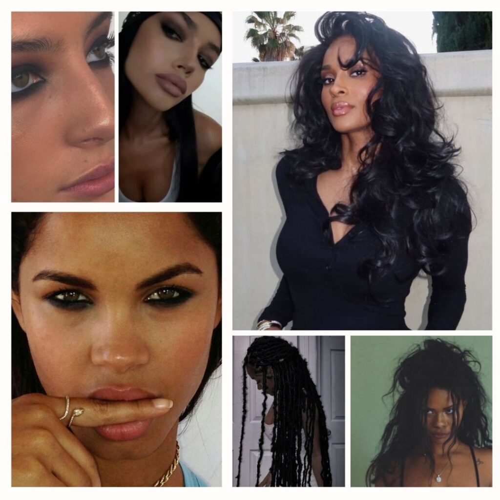 Long, windswept waves or high ponytails with volume. Deep side parts, top knots, or textured braids. Highlight natural dimension with warm-to-cool contrast (like espresso with platinum tips)