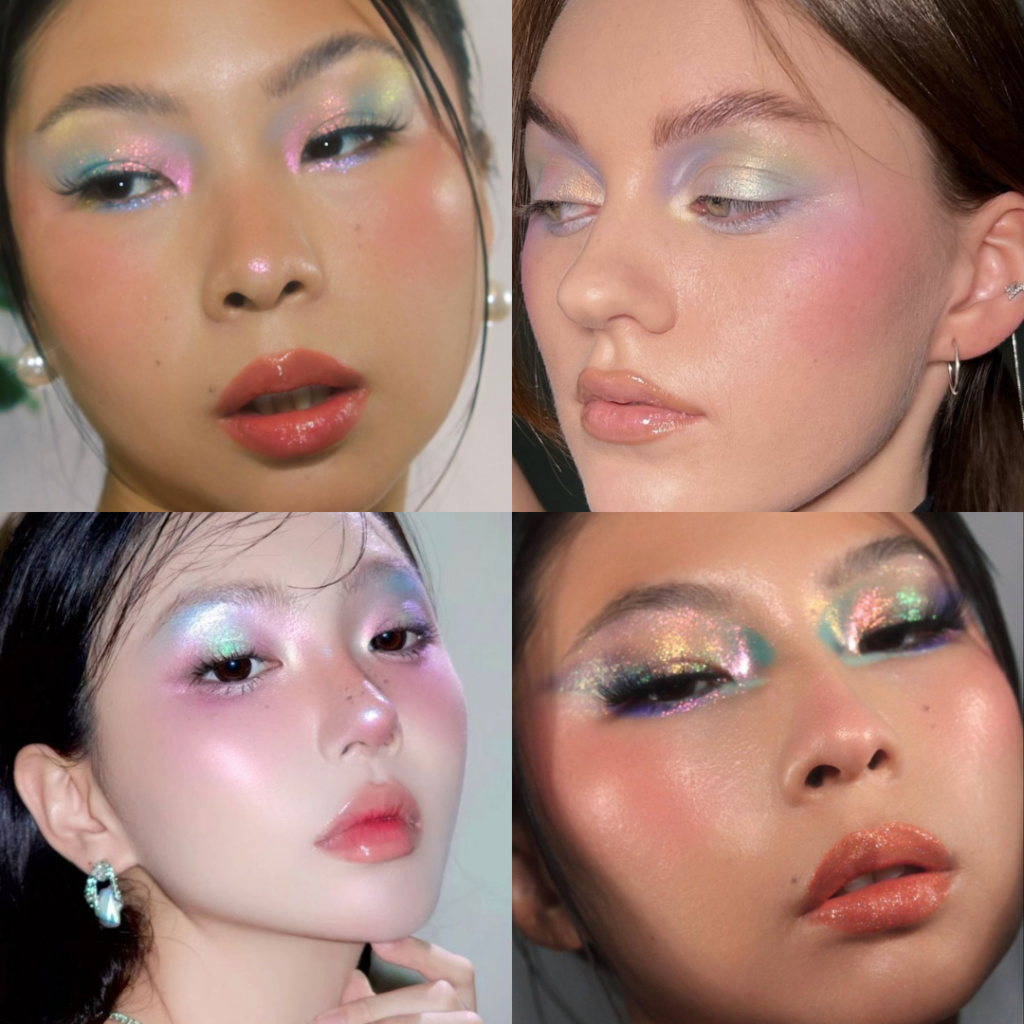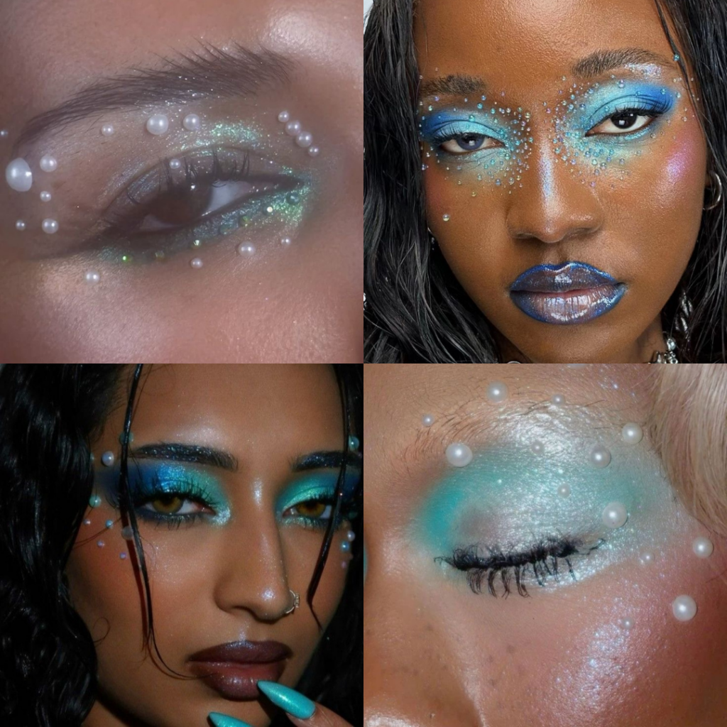 For the eyes, iridescent eyeshadow in shades of blue, green, and purple is a must. These colors mimic the hues of the ocean, creating a look that is both vibrant and magical.