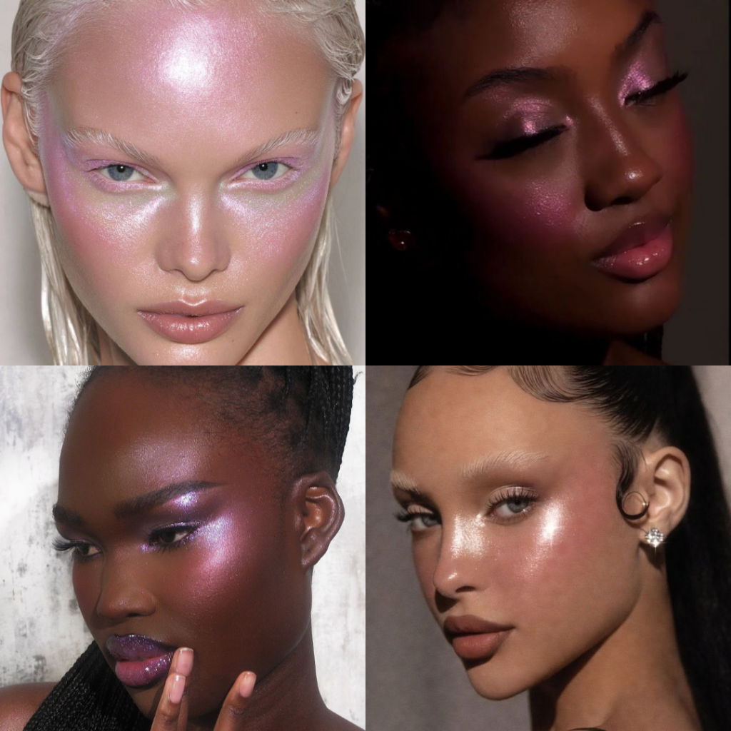 A pearlescent highlighter is essential for this look, as it adds a subtle, luminous sheen to your cheekbones, brow bones, and the bridge of your nose.