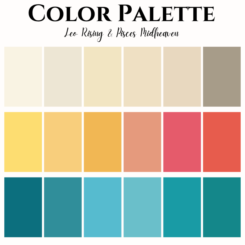 Warm gold, coral, and vivid pink for Leo’s vibrancy. Lavender, seafoam, silvery grey, and soft aqua for Pisces’ gentleness.