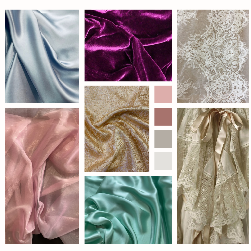 Silk charmeuse, chiffon, and satin for elegance and flow. Soft velvet in deep, moody tones. Delicate lace overlays for ethereal layers.