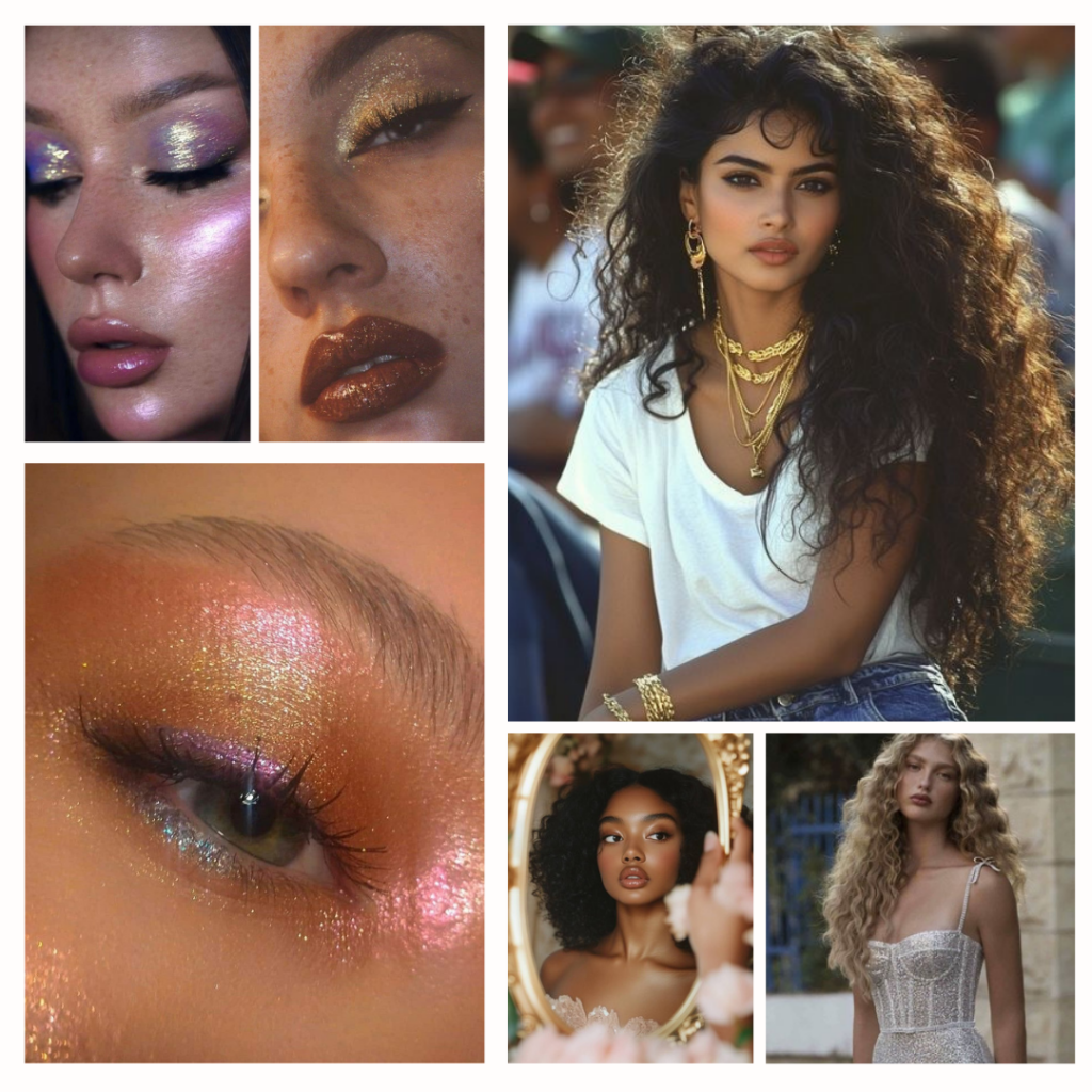 Loose, voluminous waves for romantic drama. Elegant updos with cascading tendrils. Hair accessories like jeweled combs, gold hairpins, or celestial barrettes. For the ultimate dreamy glow add subtle color washes; rose gold, soft lavender, or caramel highlights