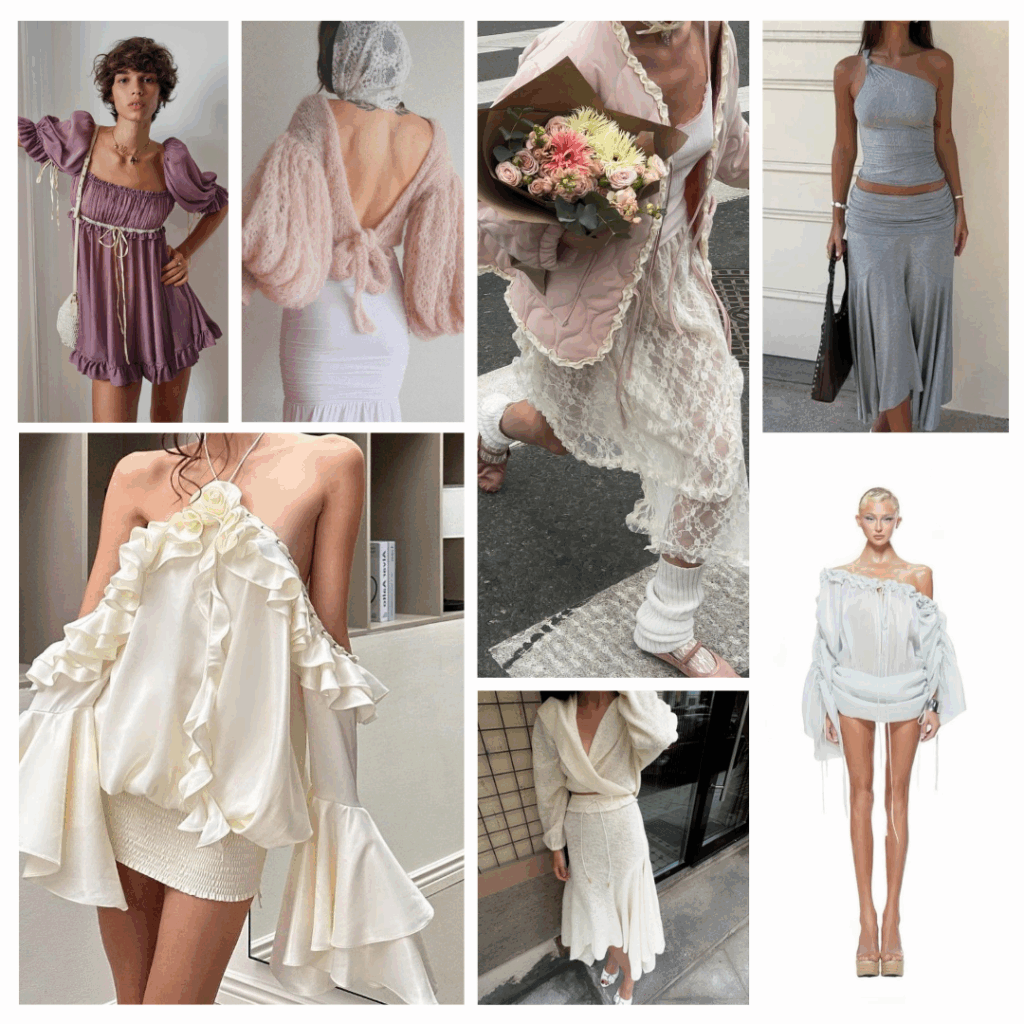Look for A-line dresses, soft draped tops, high-waisted skirts, and romantic blouses with subtle vintage details like lace, pintucks, or ruffles.