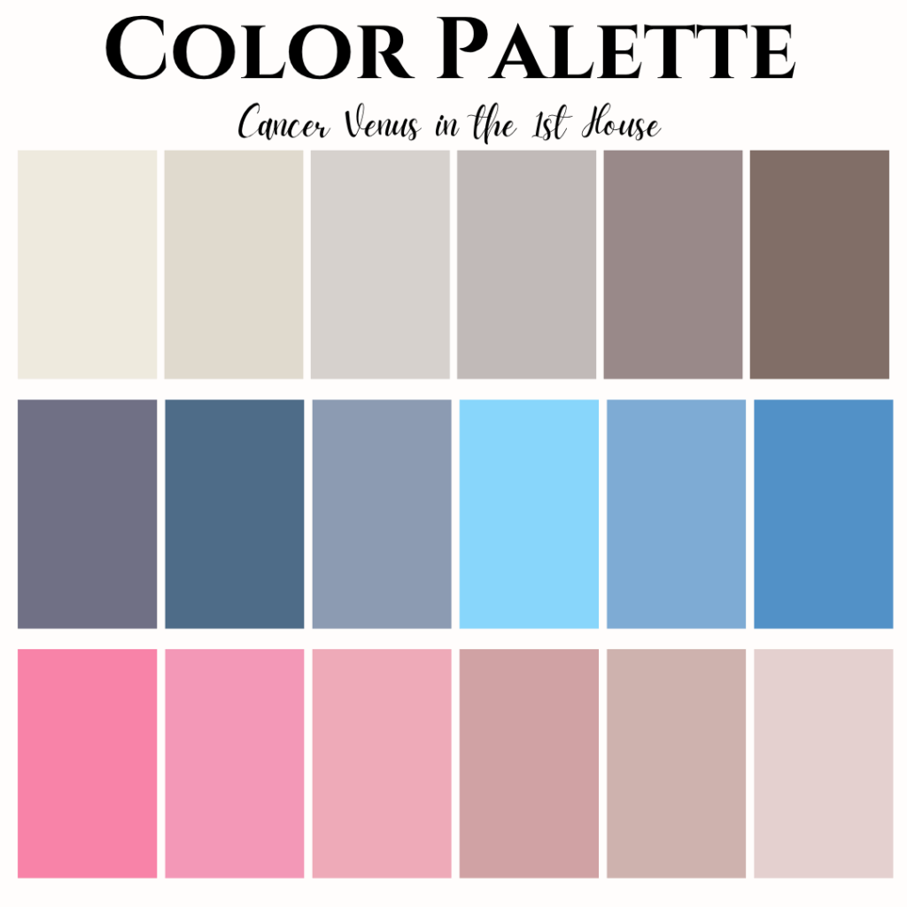 Your hero tones include rose pink, muted lavender, and soft periwinkle, all of which evoke the romance and gentleness of Cancer Venus.
