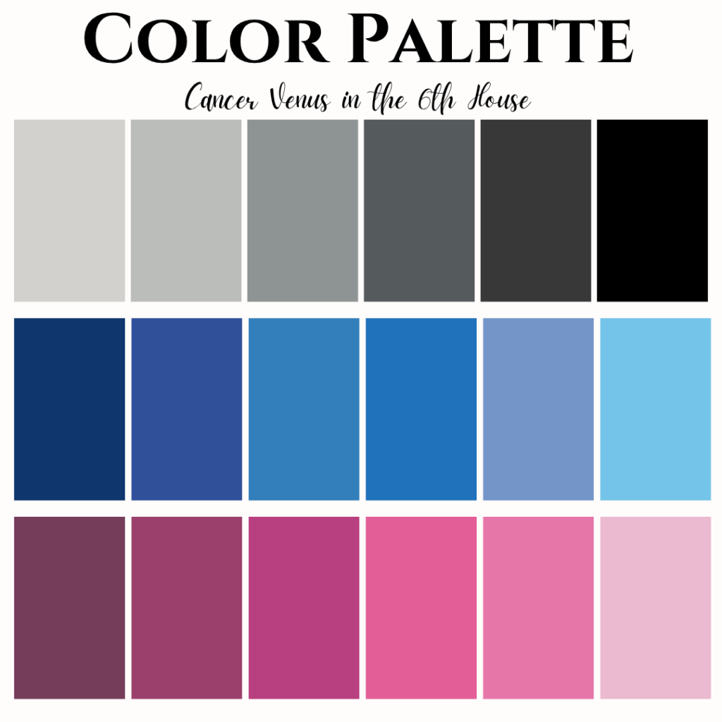 Cancer Venus in the 6th house with Aquarius rising offers a unique aesthetic that fuses innovation with intimacy. Your Aquarian colors sharpen your intuitive presence.
