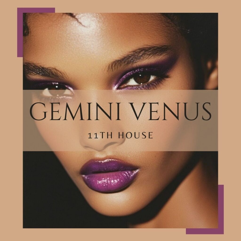 Gemini Venus in the 11th house embodies vibrancy, creativity, and an effortlessly social charm.