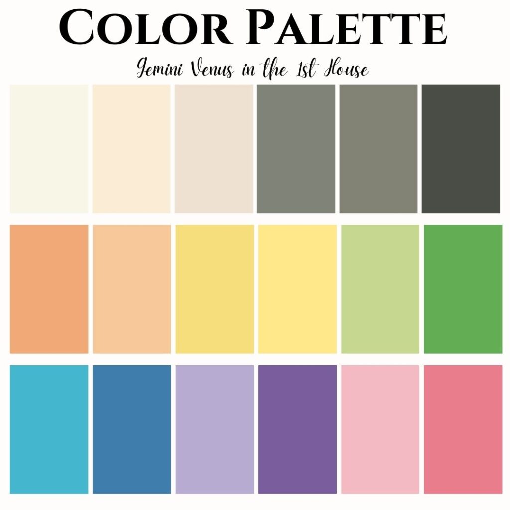 As a Gemini Rising, your color palette suggests delicate and warm pastels and fresh, clear shades that highlight your sparkling energy. Think soft corals, light aquas, pale yellows, and airy periwinkles. Colors that mirror the lively and light-hearted nature of your Gemini Venus.