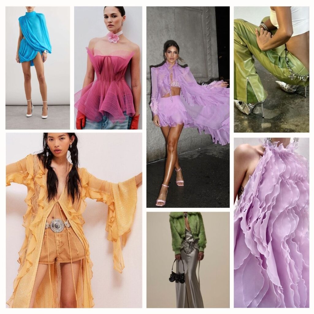 Opt for asymmetrical cuts, structured blazers, dramatic wide-leg trousers, and sculptural mini dresses that create a futuristic yet playful look.