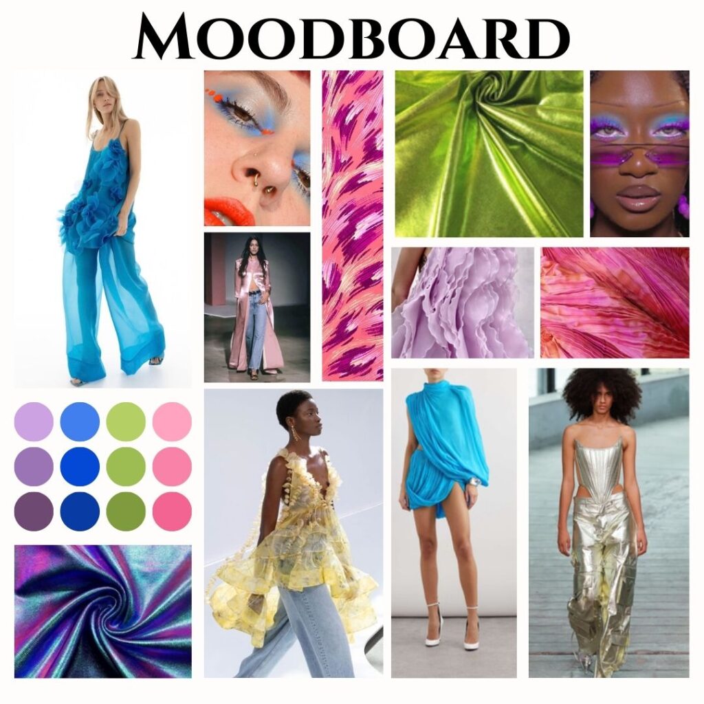 Digital-inspired prints, metallic finishes, and bold stripes add a futuristic edge.