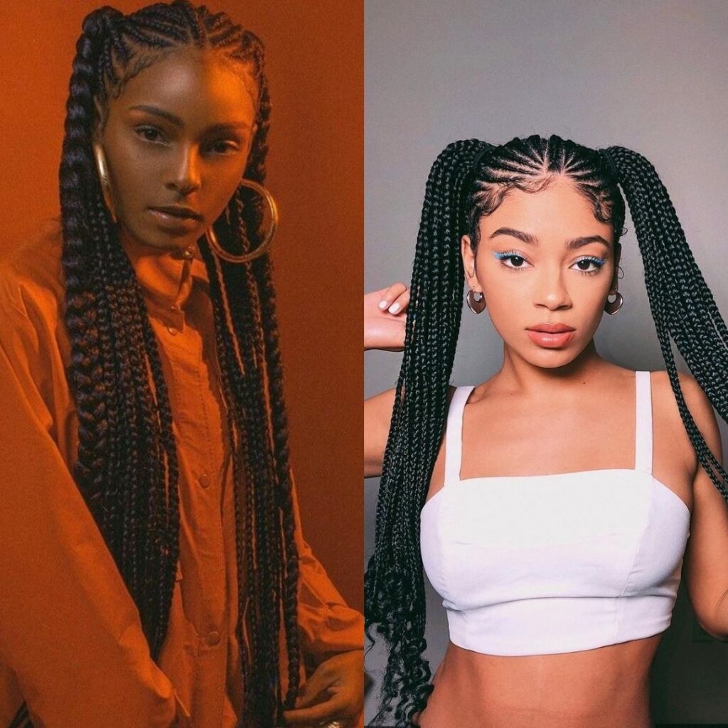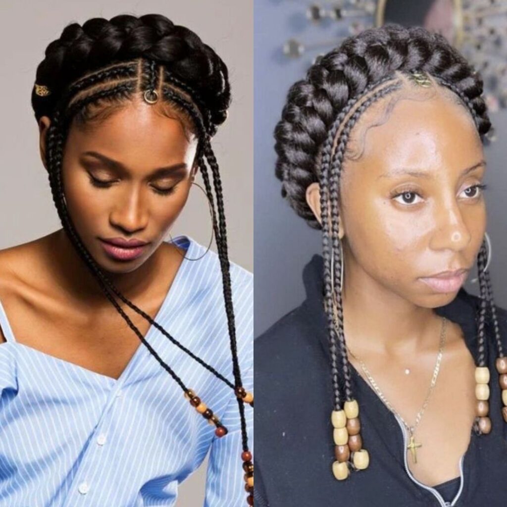 Side braids framing the face draw attention to their large, “bull-shaped” eyes and give a slight contour to their fuller features.