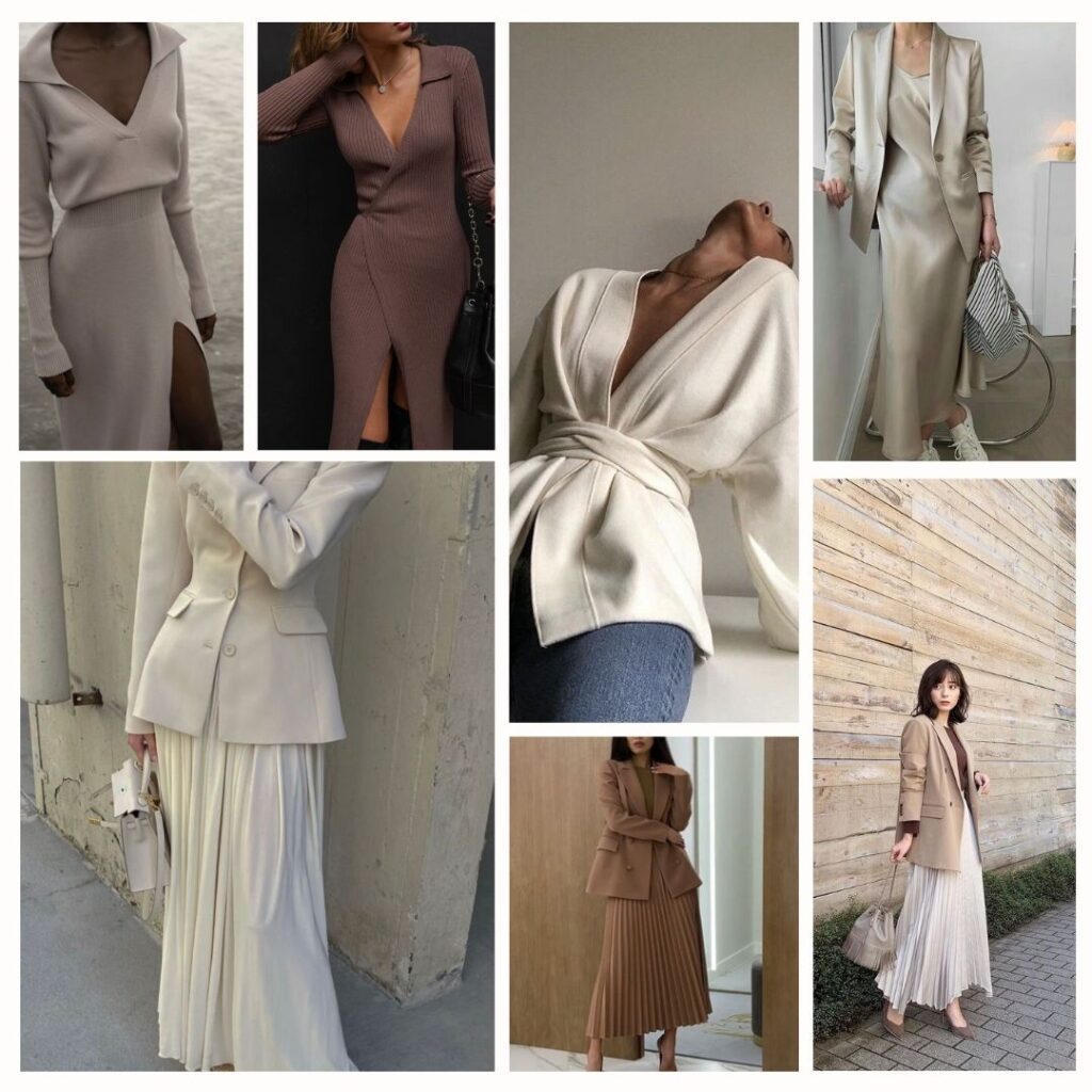 Draped silk blouses, fitted midi dresses, and high-waisted trousers create an effortlessly chic and balanced aesthetic.
